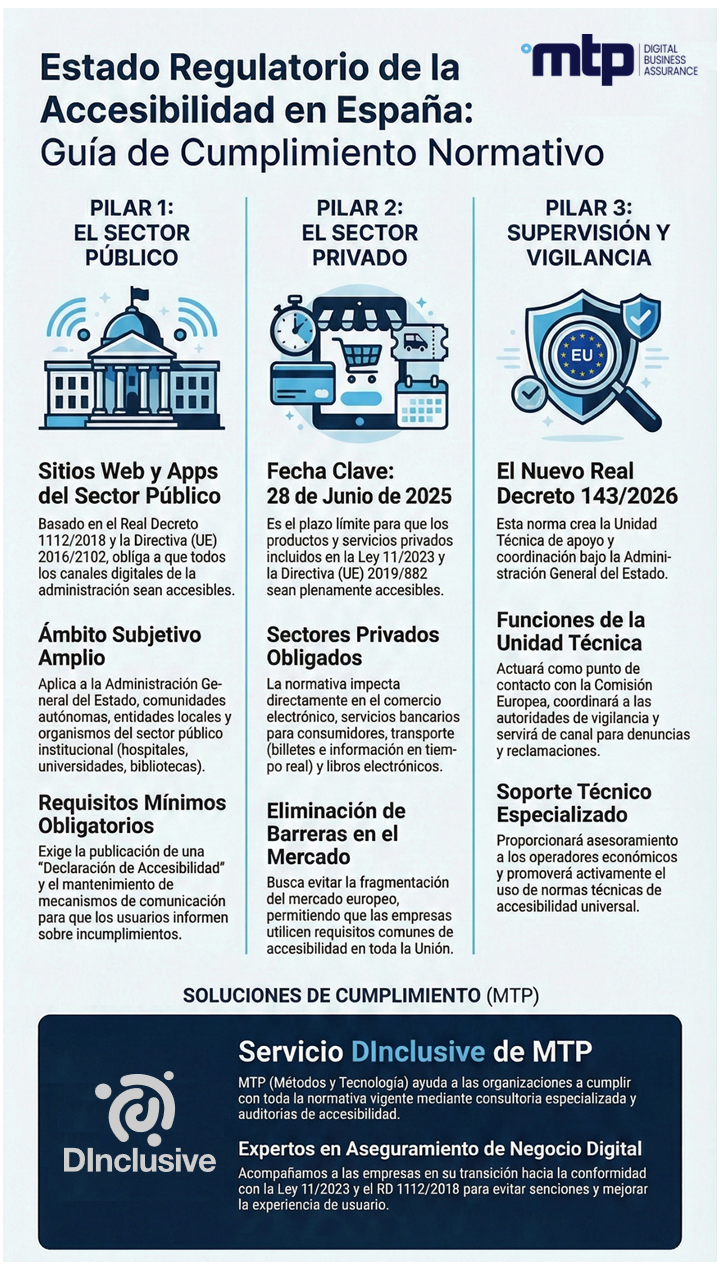En MTP Métodos y Tecnología llevamos años trabajando en auditoría, verificación y certificación de accesibilidad, ayudando a las organizaciones a anticiparse al riesgo regulatorio y a integrar la accesibilidad desde el diseño.