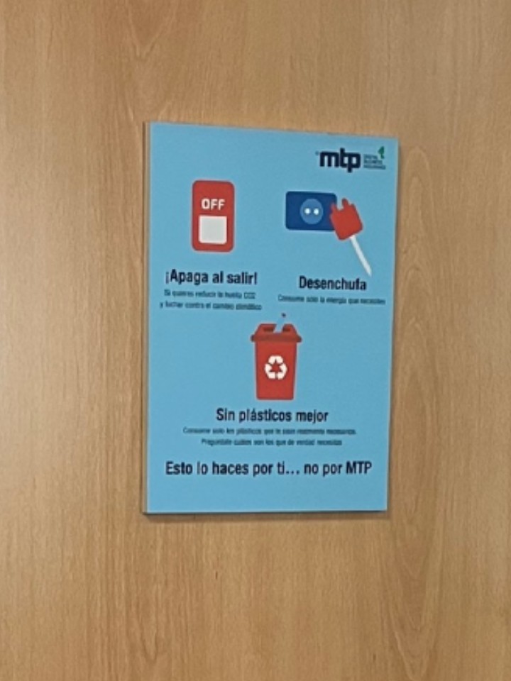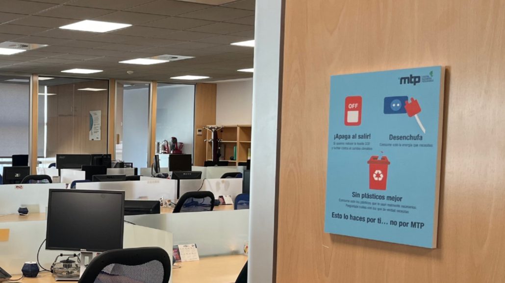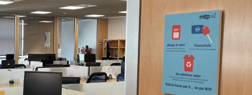 En nuestras oficinas queda muy claro desde el primer momento la necesidad de contribuir entre todos a los objetivos generales de sostenibilidad. Unos carteles repartidos por los diferentes espacios nos recuerdan que podemos actuar positivamente y sumar esfuerzos para el objetivo común con pequeños actos en nuestro desempeño personal y profesional.