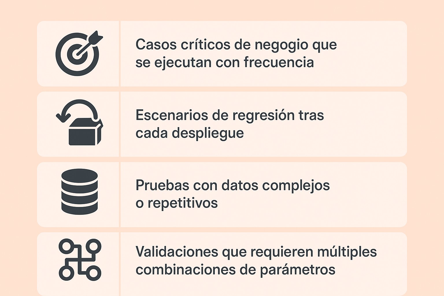 No todas las pruebas deben automatizarse; es clave evaluar coste-beneficio. Se recomienda priorizar: