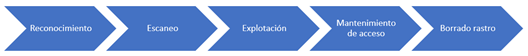 - Borrado rastro: Por último, está última fase también depende de la efectividad del ataque; se trata de borrar cualquier rastro que pueda haber quedado de la intrusión con el objetivo que no se pueda obtener información del acceso no autorizado en caso de una posible investigación posterior del incidente.